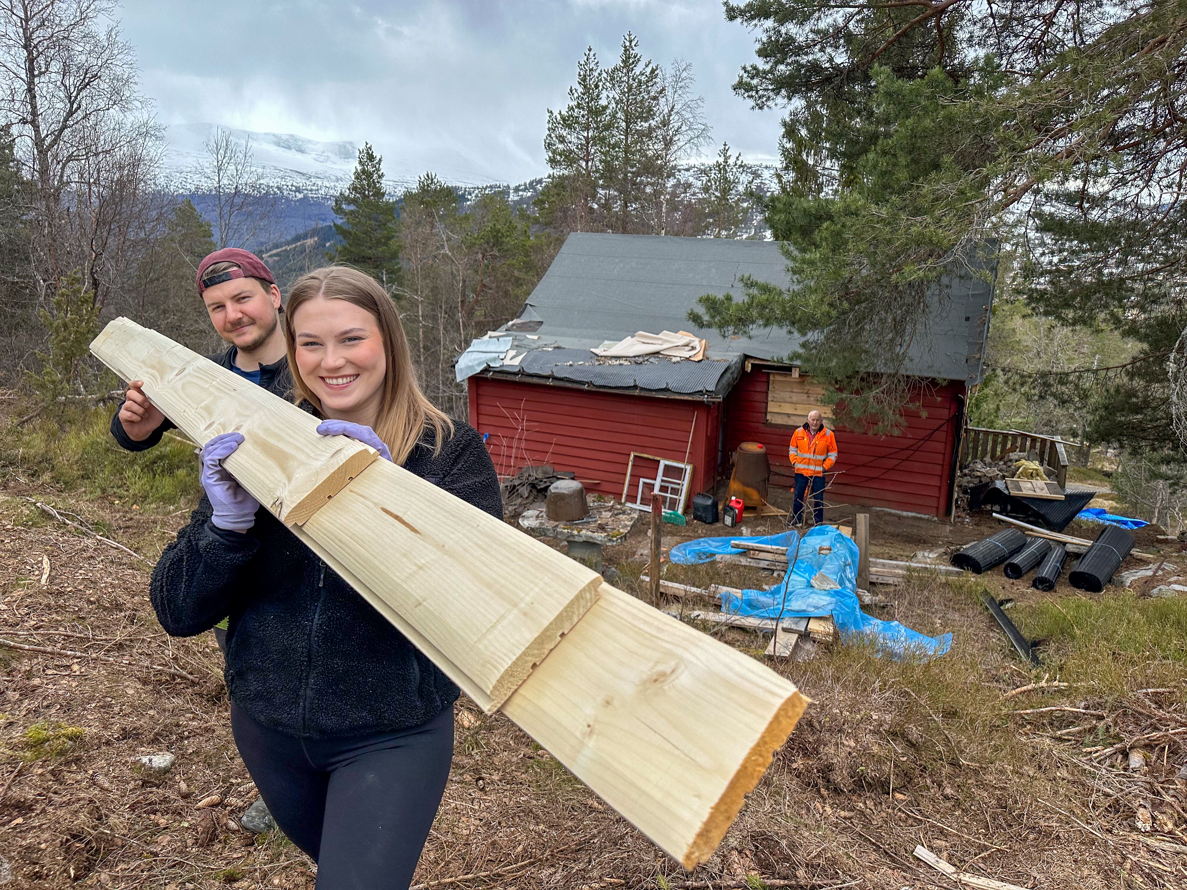 Da Helene og Rasmus fikk en forfallen hytte gratis, var det nyttig med en kunnskapsrik og nevenyttig bestefar i nærheten.
